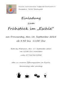 Genießen Sie das Frühstück gemeinsam mit netten Menschen. Anmeldungen sind immer bis Mittwoch 12:00 Uhr vor dem angegebenen Termin unter der Tel-Nr.: 07722 8695330 erbeten. |