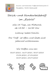 Isabel Schilli bietet jede 1. und 3. Woche im Monat von 18:30 – 20:30 Uhr und jede 2. und 4. Woche im Monat von 14:30 – 16:30 Uhr einen Handarbeitstreff im "Eschle" für alle Handarbeits- und Strickhexen an. Jeder und auch Gäste die gerne regelmäßig oder auch nur gelegentlich zusammen handarbeiten möchten, sind herzlich willkommen. Auch eine einmalige fachliche Unterstützung kann in Anspruch genommen werden. |